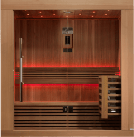 Traditional or Finnish saunas use a heating element, such as an electric or wood burning stove, to create a high-heat environment between 150°F to 230°F. They offer a classic sauna experience with intense heat and a dry atmosphere. However a steam room environment can also be created by progressively pouring water onto a heater’s rocks.