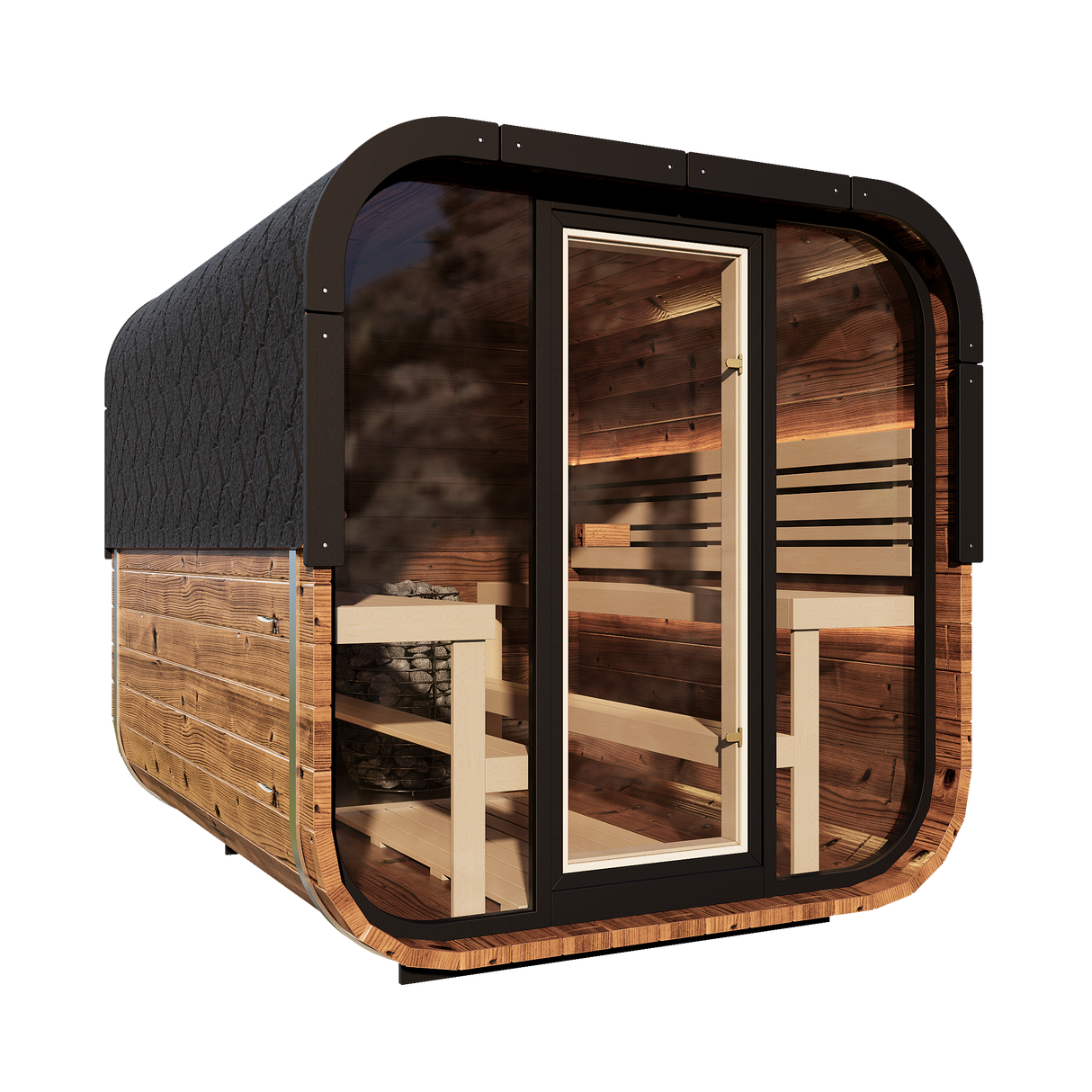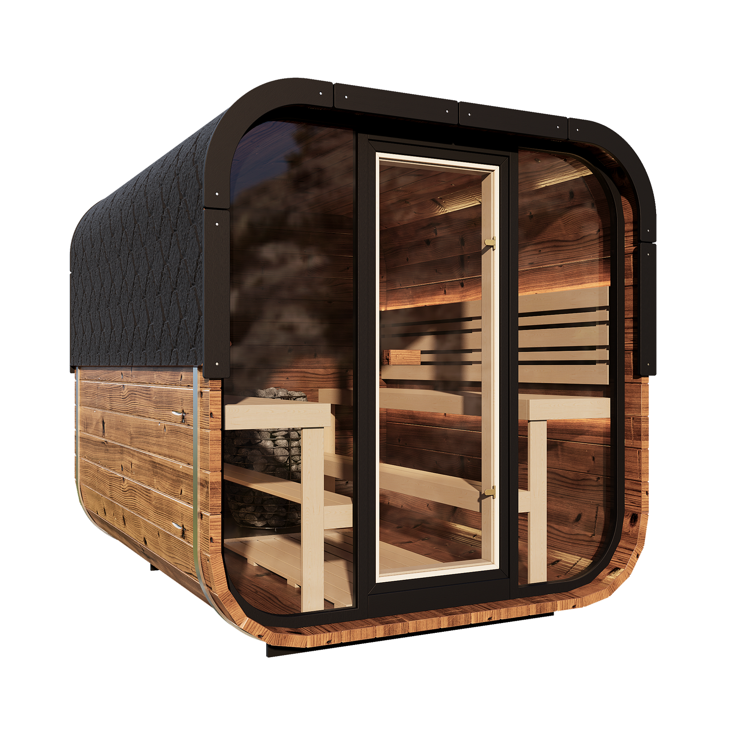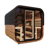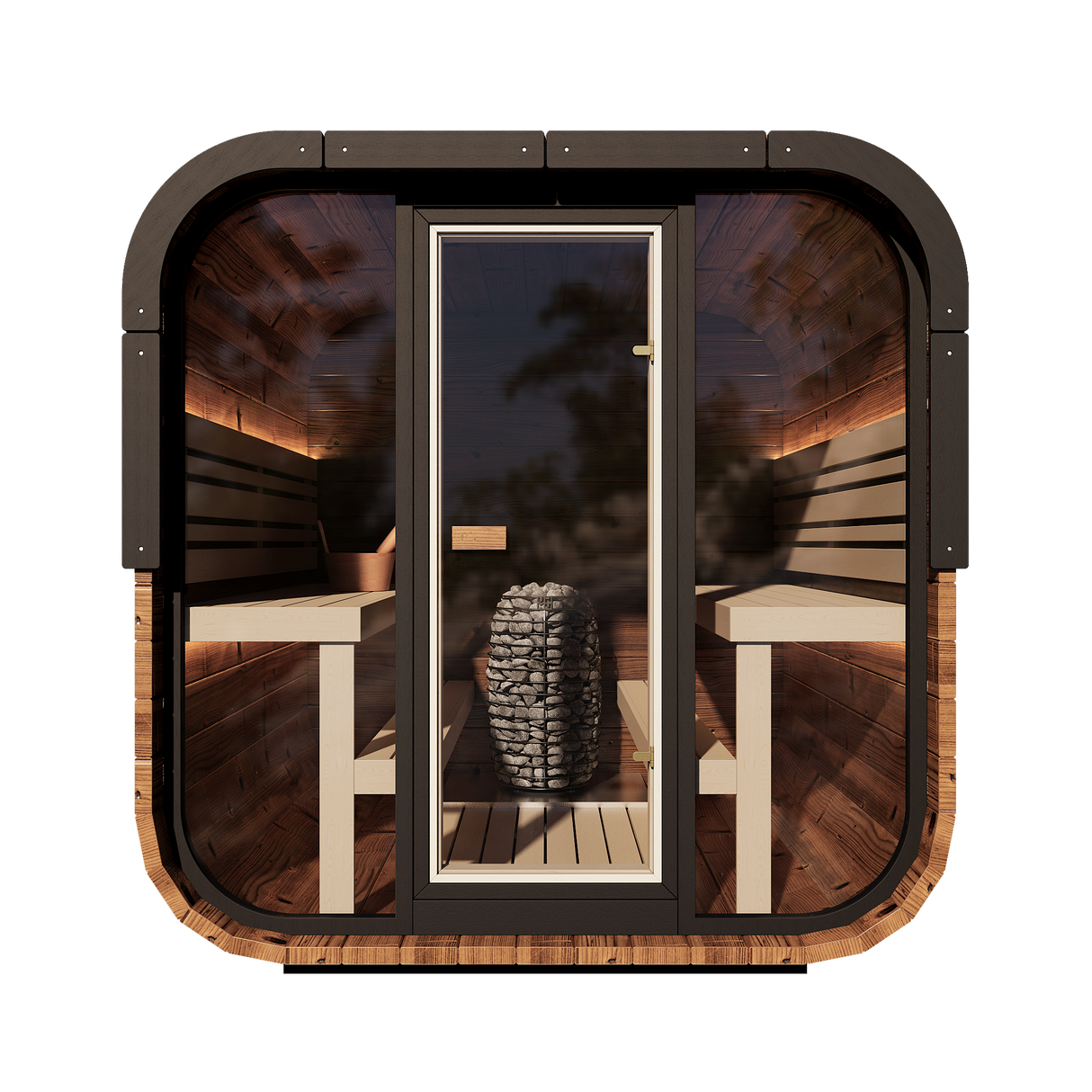 The front glass version of our largest Governor series sauna, the Grand Governor, offers even more space to unwind, comfortably accommodating up to 6 people. Its modern cube design, crafted from thermally modified wood and paired with a durable roof kit, ensures superior heat retention and all-weather durability. The sleek, curved edges and stunning full front glass wall create a seamless blend of modern elegance and organic warmth, making it a striking addition to any indoor or outdoor space.