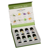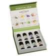 A box of Sauna essential oils with labeled bottles inside, arranged neatly in a presentation box.