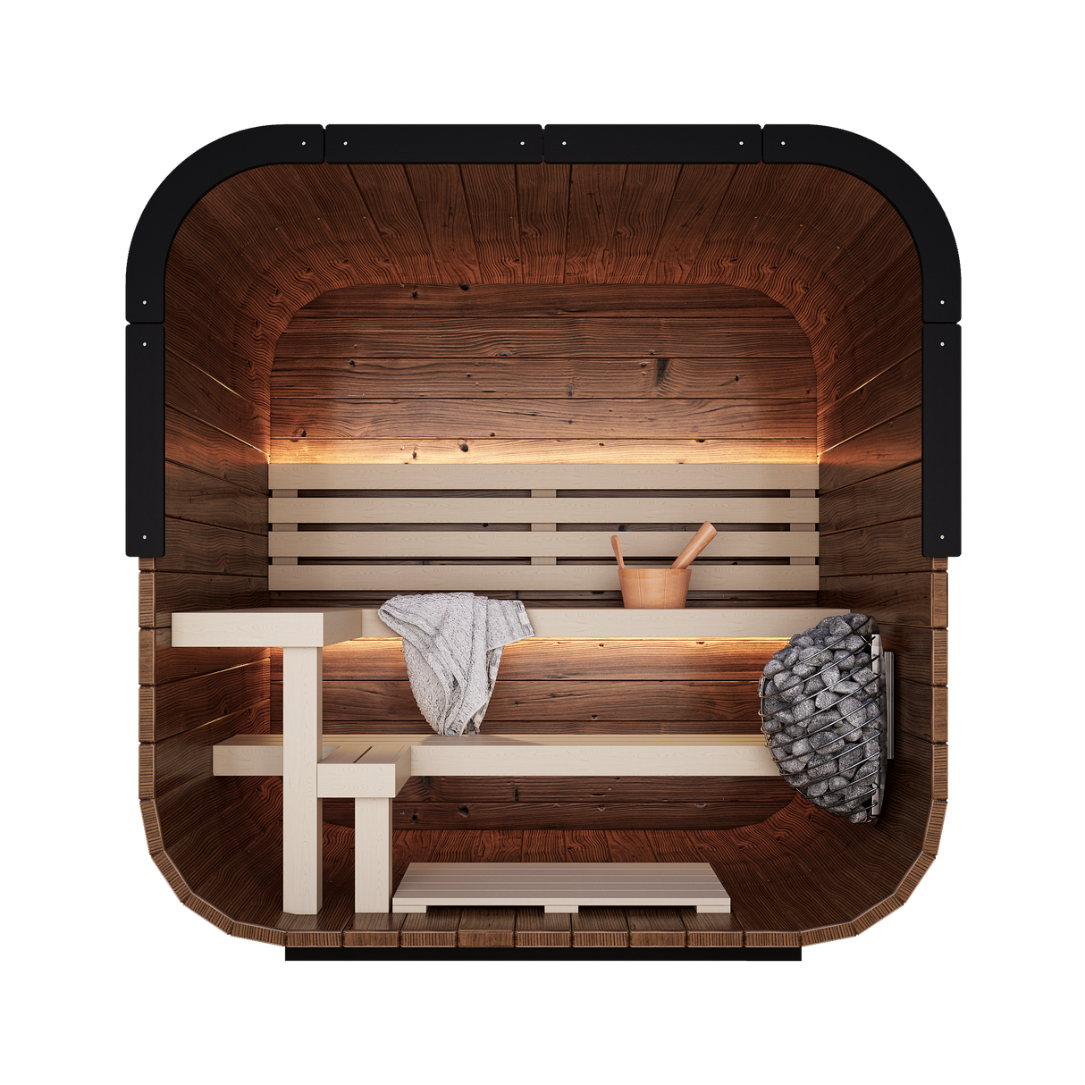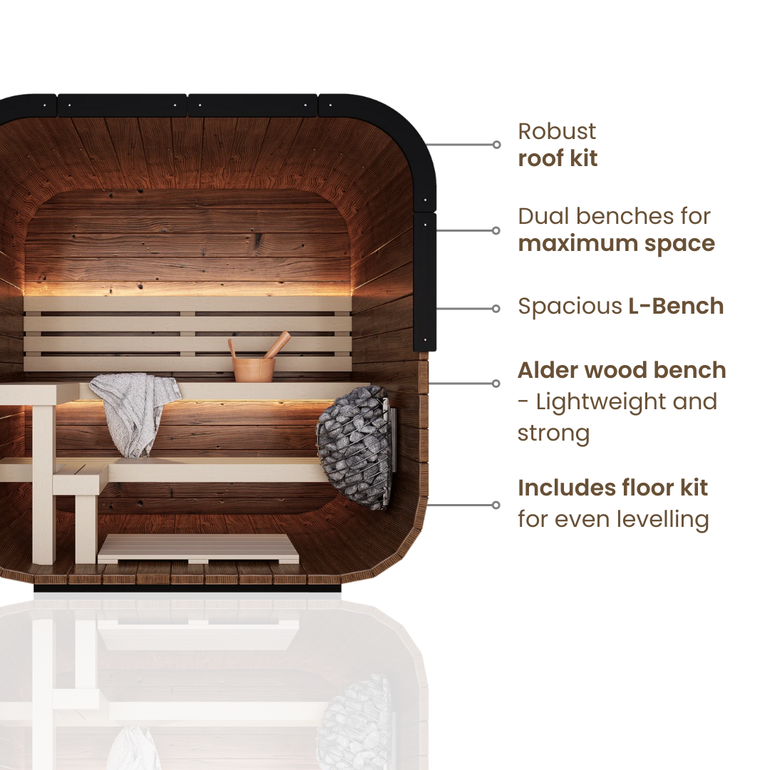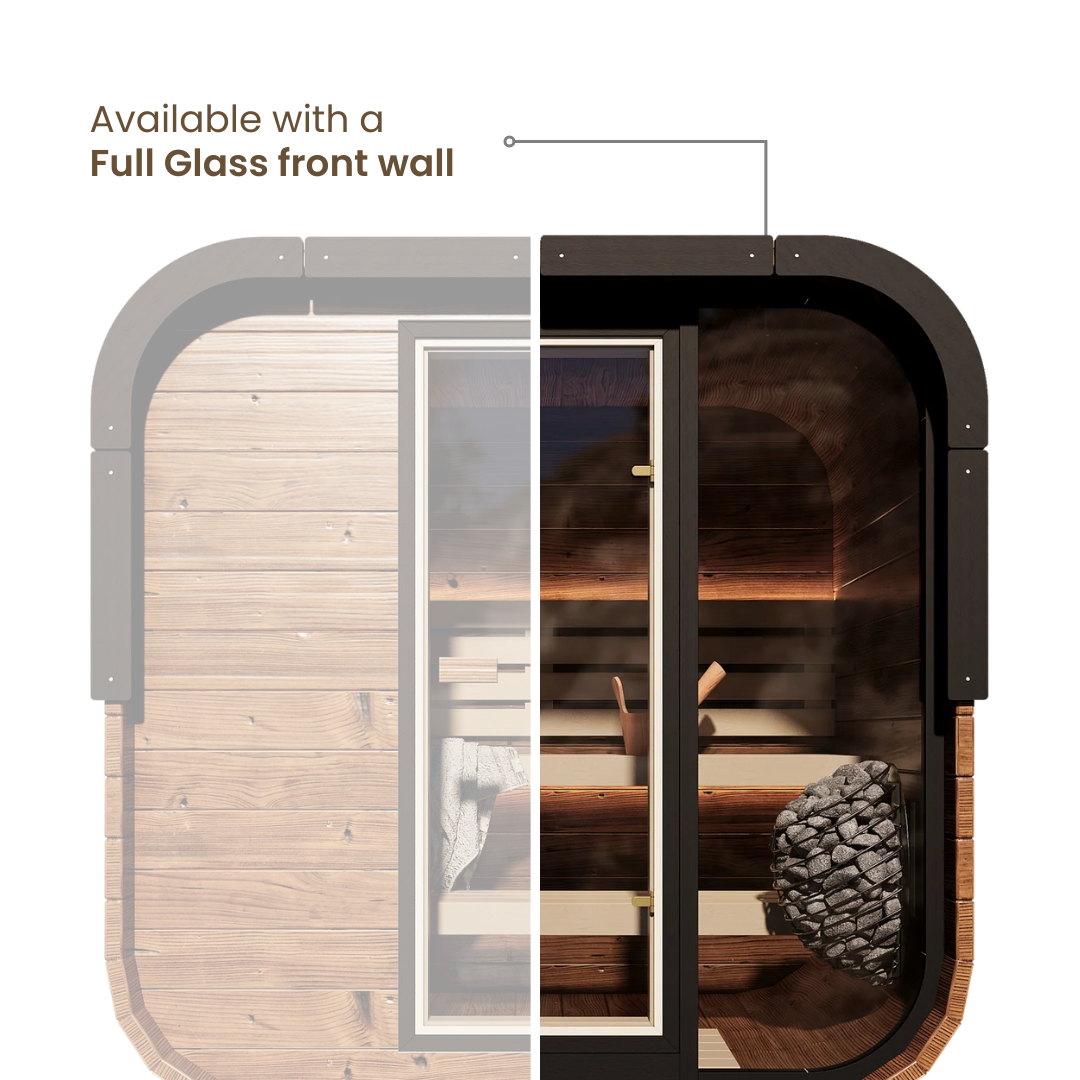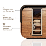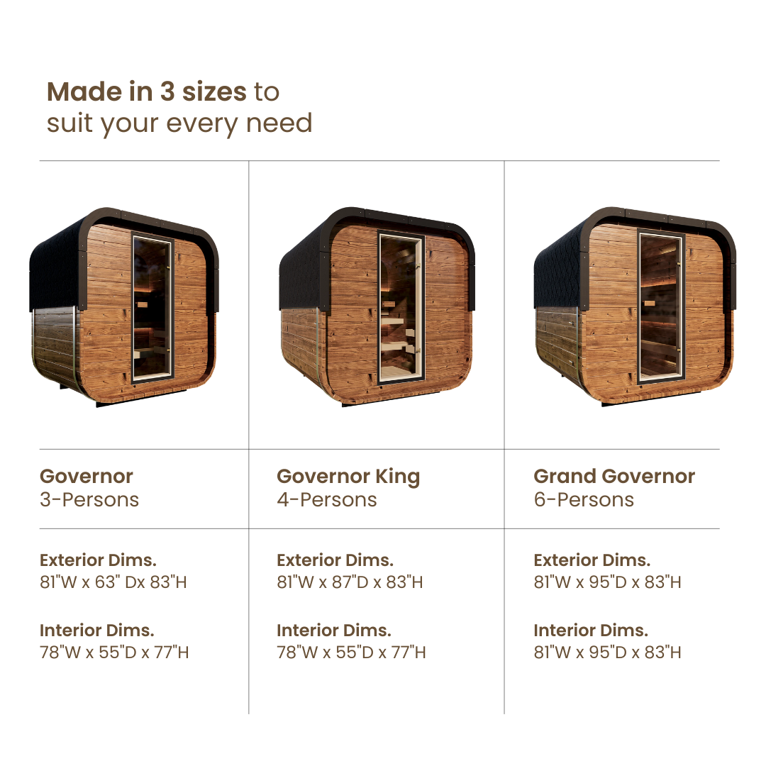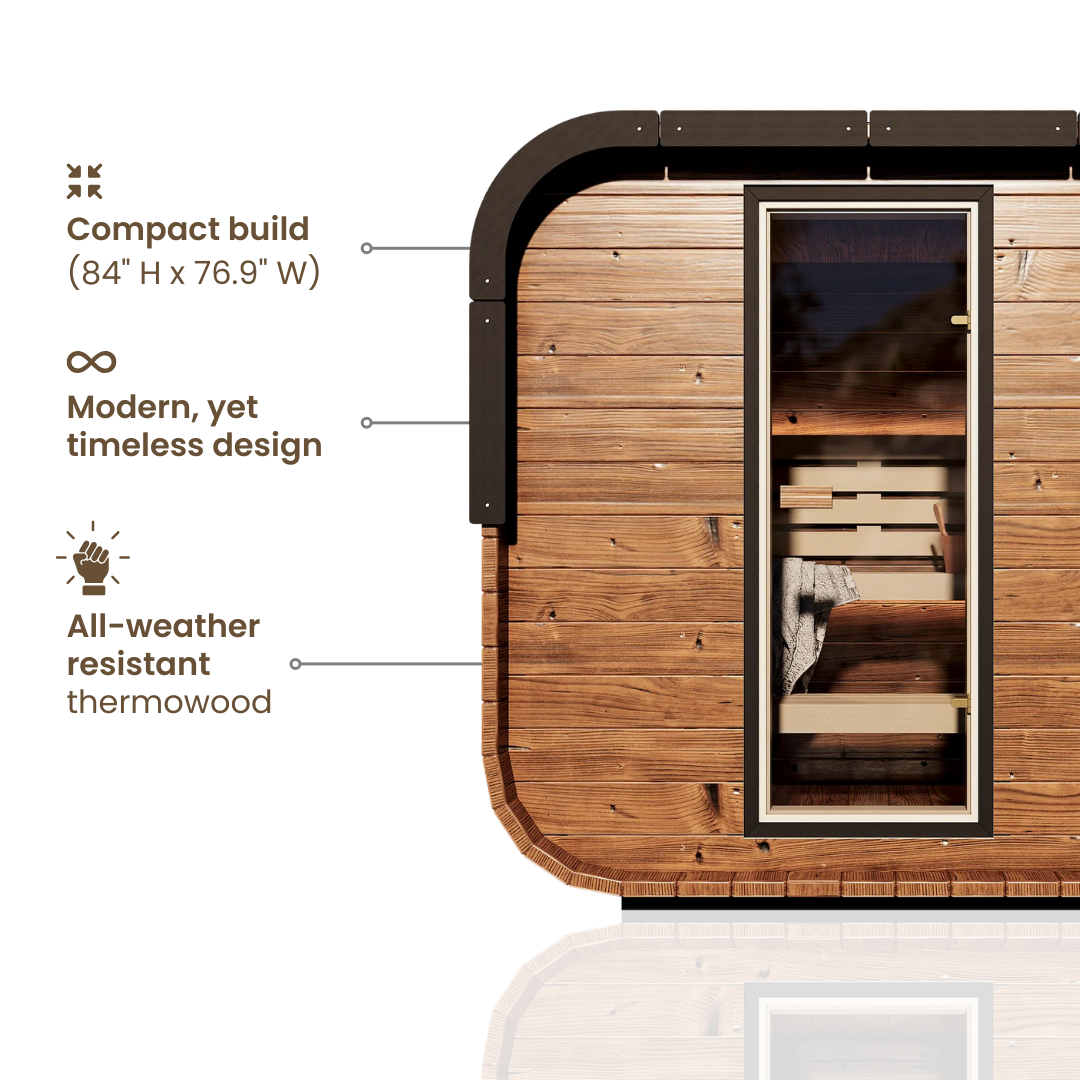 Experience the perfect blend of contemporary design and timeless relaxation with our brand new Governor series. This modern cube design sauna is crafted from premium thermally-modified pine, delivering superior heat retention with weather-resistant qualities. Its modern cubed design maximizes space efficiency while creating a visually appealing centerpiece for any backyard or wellness area.