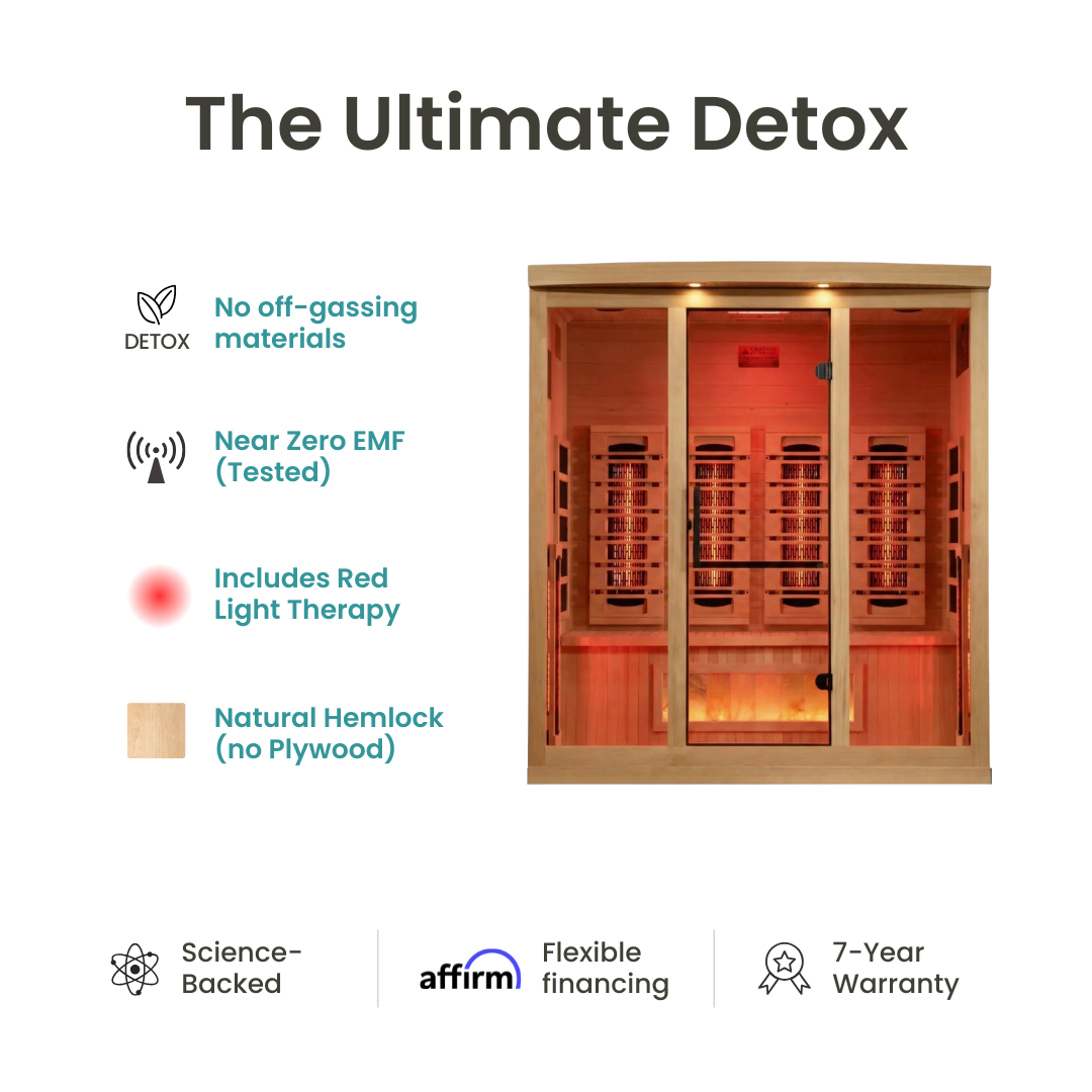 The Grand Element 4 person full spectrum infrared sauna features NIR, MIR & FIR with near-zero EMF heating in a spacious cabin, improving recovery, detox, circulation & family wellness.