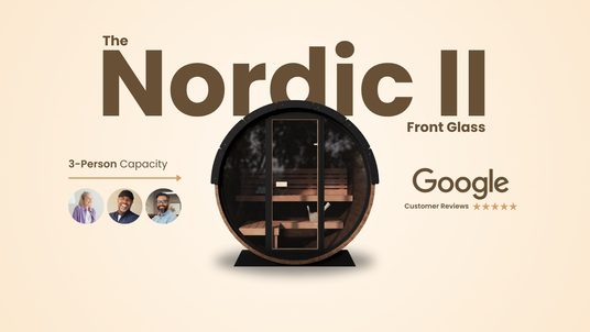 The Nordic II Front Glass adds a modern touch with its all-glass front. Crafted from thermally modified Nordic pine, this 3 person sauna is elegantly designed and is tall enough to stand in comfortably. Featuring a width-long, elevated bench, the Nordic II Front Glass offers extra room for you to relax or share with friends and family. Nordic II includes a watertight shingle roof kit, ensuring rain and snow stay out maintaining the ideal environment inside. Quality materials and superb engineering make this the ideal outdoor sauna for any backyard or patio.